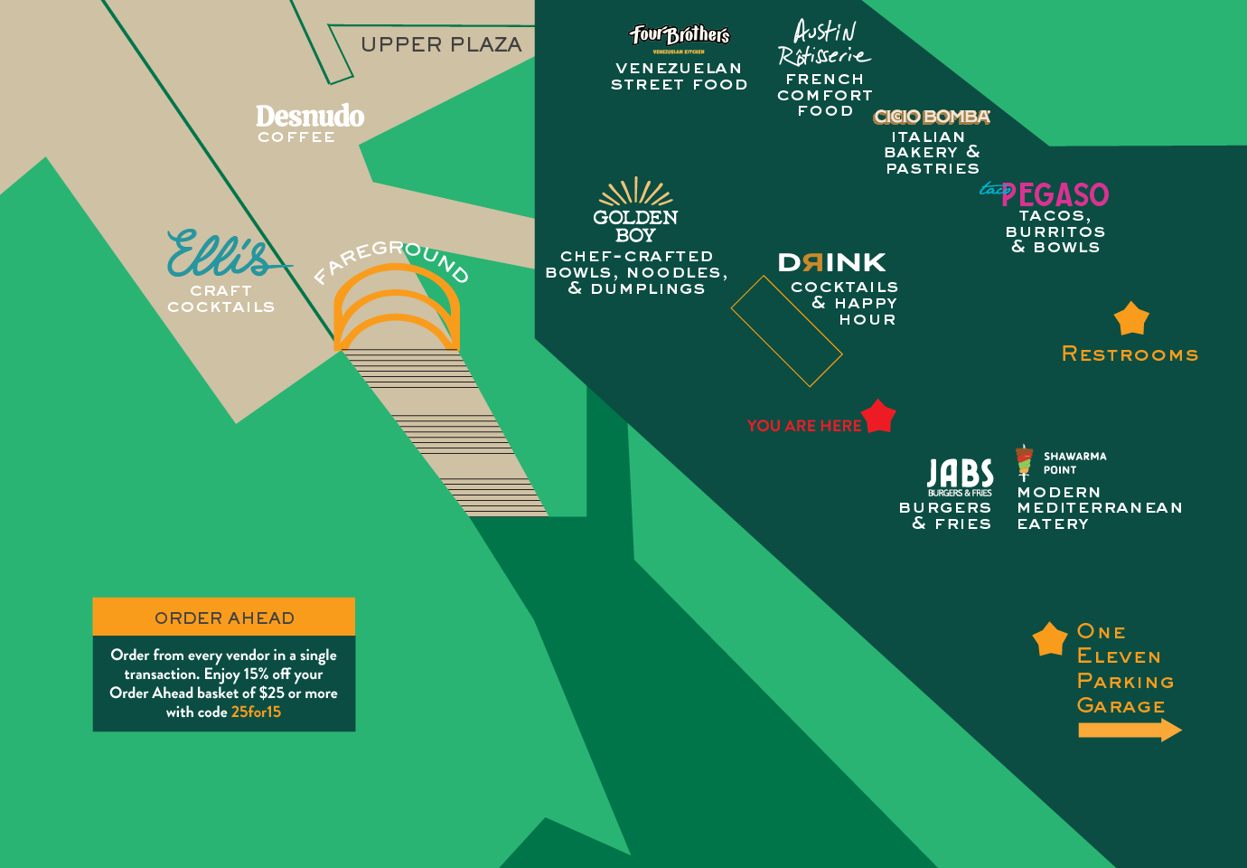 Fareground also offers contactless order ahead, order online, and delivery services, available at order.faregroundaustin.com. Fareground offers limited complimentary 20 minute parking for Order Ahead pickup orders in two designated spots on the surface lot parking adjacent to Ellis on Brazos Street that are marked with Fareground Order Ahead signage. Order Ahead pickup parking is only permitted in these 2 designated parking spots.